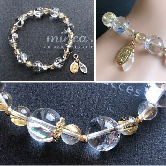 虹色の煌めきが美しい天然のアイリスクォーツとルチルクォーツのデザインブレスレットです。